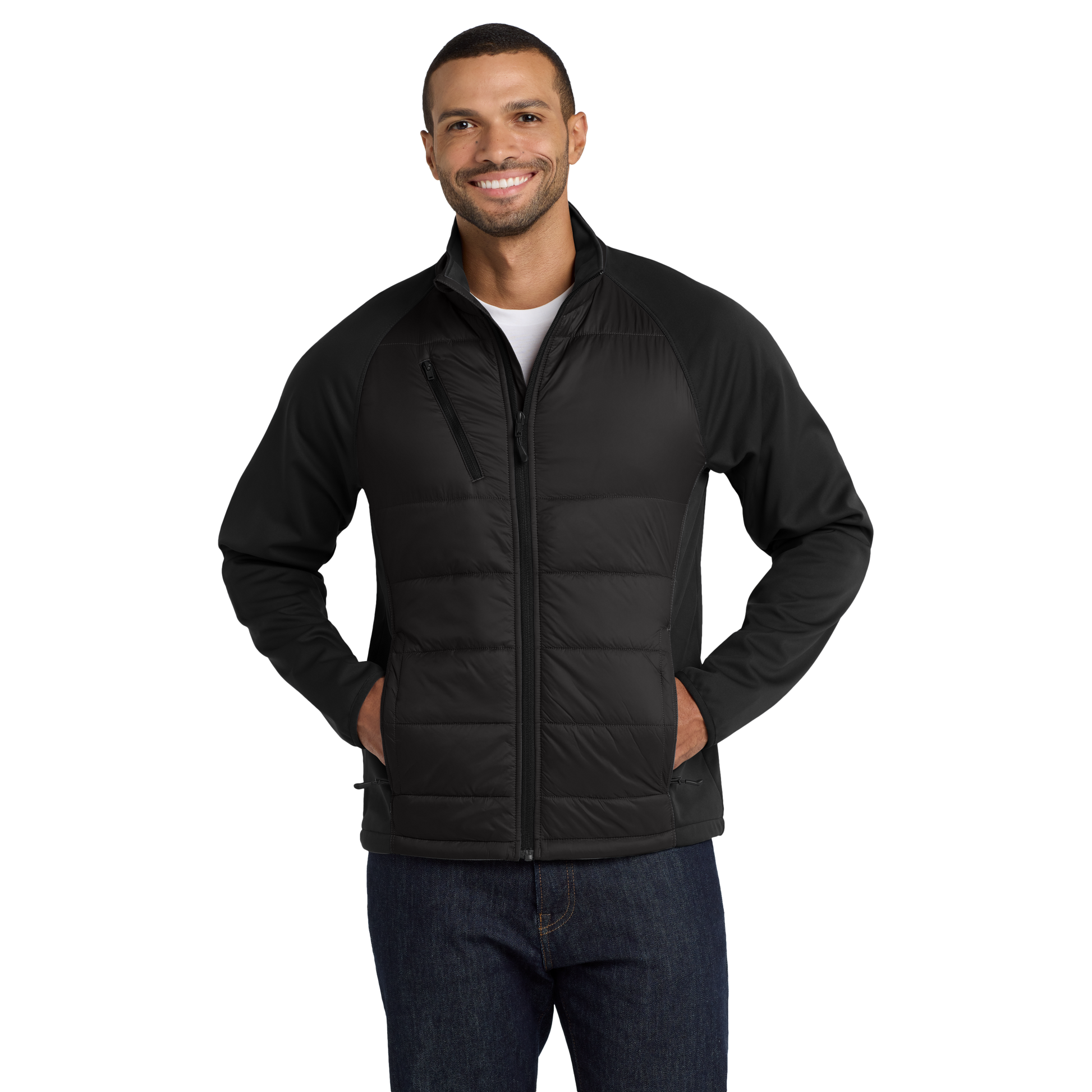 Quilted front and back panels join a wind-resistant, water-resistant soft shell to make the Hybrid a trend-right stretch performance jacket with urban edge.
